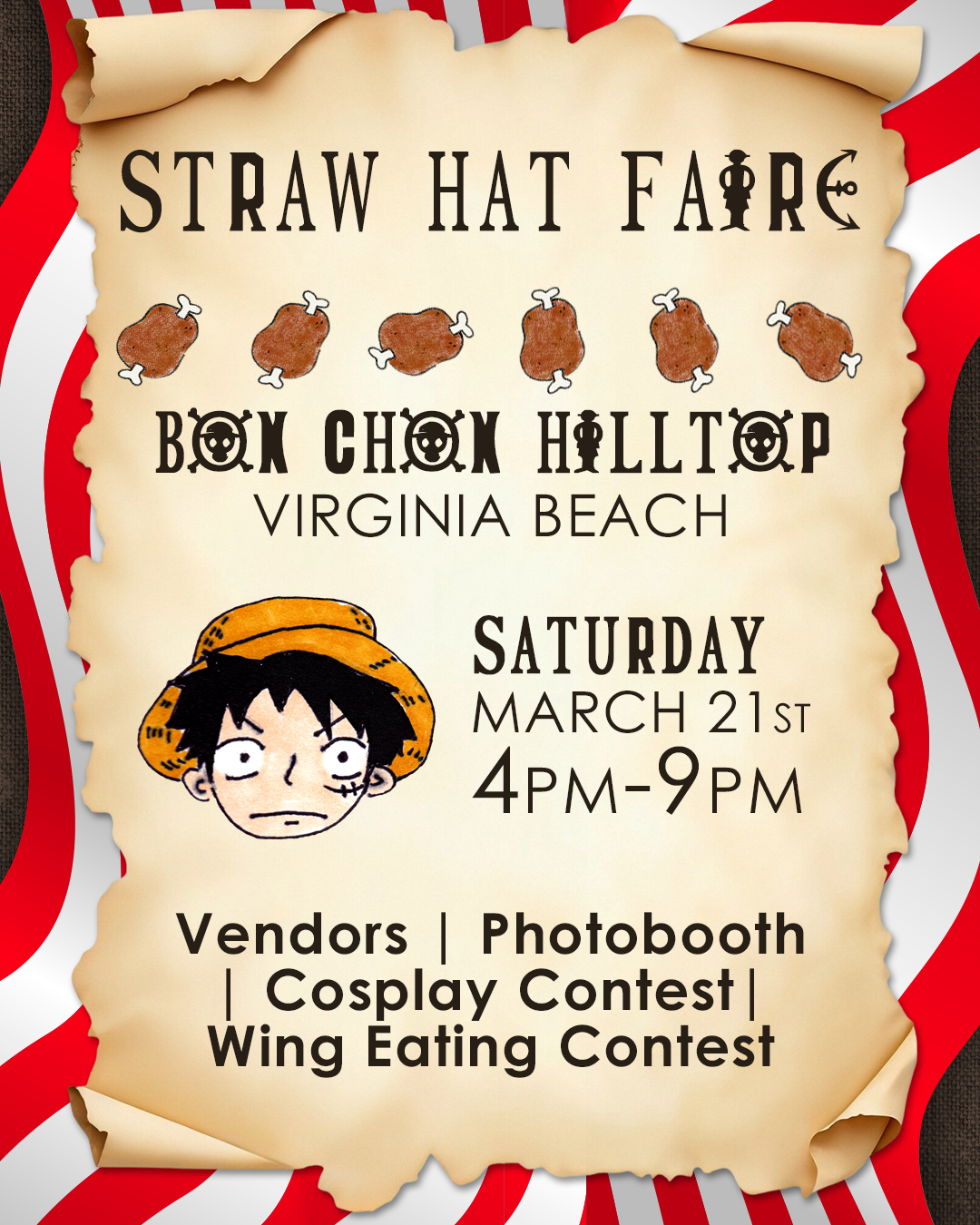 We’ll be celebrating all things One Piece!! There will be several local artists, a photobooth, cosplay contest, and a wing eating contest!
